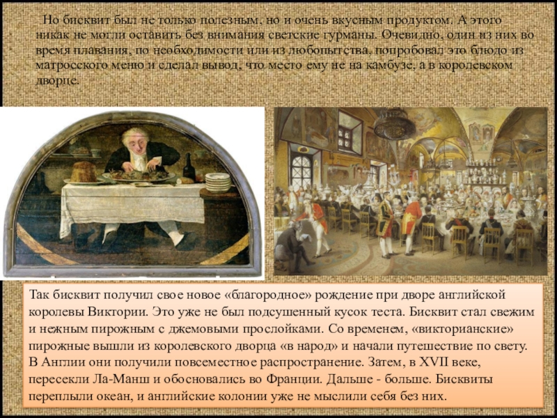 Так бисквит получил свое новое «благородное» рождение при дворе английской королевы Виктории. Это уже не был подсушенный кусок теста. Бисквит стал свежим и нежным пирожным с джемовыми прослойками. Со временем, «викторианские» пирожные вышли из королевского дворца «в народ» и начали путешествие по свету. В Англии они получили повсеместное распространение. Затем, в XVII веке, пересекли Ла-Манш и обосновались во Франции. Дальше - больше. Бисквиты переплыли океан, и английские колонии уже не мыслили себя без них.
