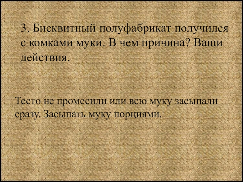 Недостаточно взбили тесто, долго замешивали с мукой, тесто долго не выпекалось, много муки. Полуфабрикат использовать для пирожного картошка или на бисквитную крошку.