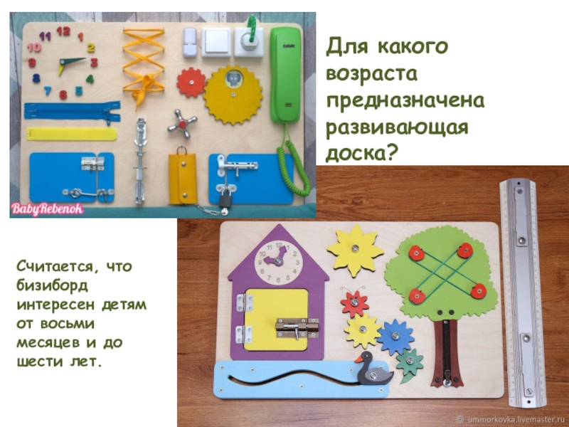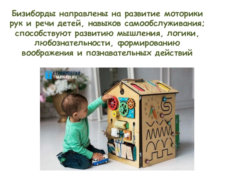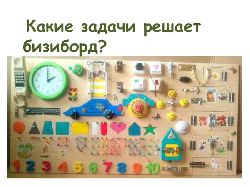 Презентация, доклад на тему Бизиборд – умная игрушка, которая познакомит ребенка с бытовыми предметами-мелочами и отвлечет от настоящих опасностей.