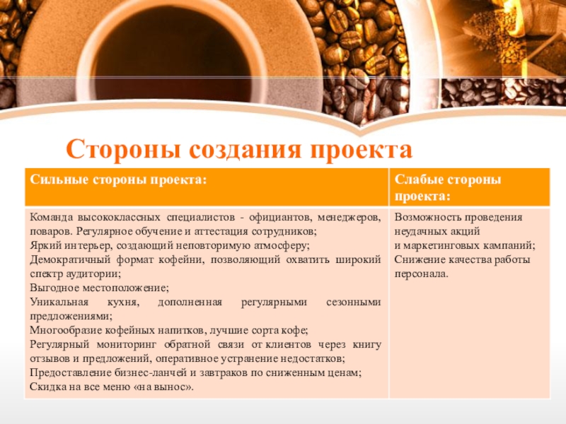 В данном бизнес-плане мы рассматриваем открытие кофейни с большим выбором кофе и наличием алкогольных напитков. Кроме того, в заведении предполагается наличие полноценной кухни с холодным, горячим и кондитерским цехом.