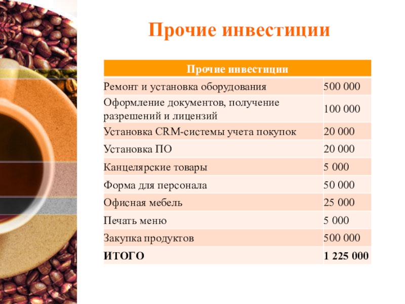 эспрессо, капучино, латте, ристретто, американо, но и разнообразные фирменные кофейные коктейли. Можно предложить посетителям выбирать размер чашки, а также экспериментировать с добавлением сиропов и топпингов. Для разработки меню желательно найти опытного бариста, который поможет вам пополнить ассортимент эксклюзивными напитками.