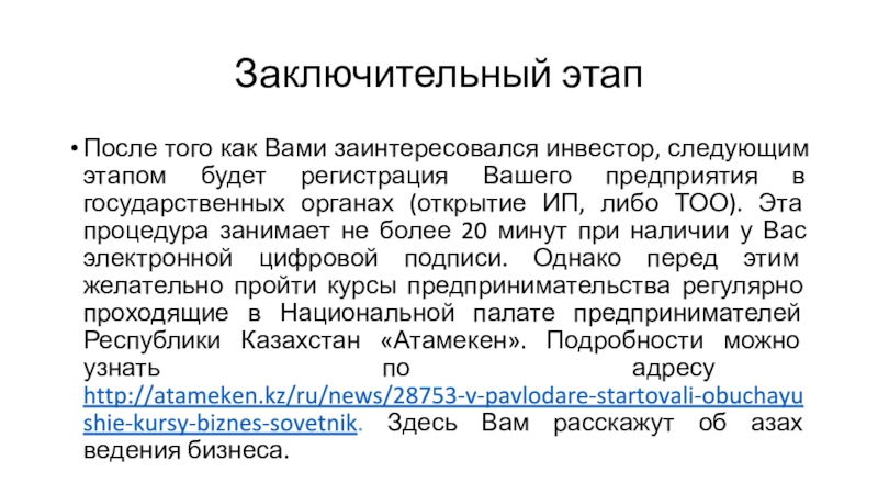 Вашего предприятия в государственных органах (открытие ИП, либо ТОО). Эта процедура занимает не более 20 минут при наличии у Вас электронной цифровой подписи. Однако перед этим желательно пройти курсы предпринимательства регулярно проходящие в Национальной палате предпринимателей Республики Казахстан «Атамекен». Подробности можно узнать по адресу http://atameken.kz/ru/news/28753-v-pavlodare-startovali-obuchayushie-kursy-biznes-sovetnik. Здесь Вам расскажут об азах ведения бизнеса.