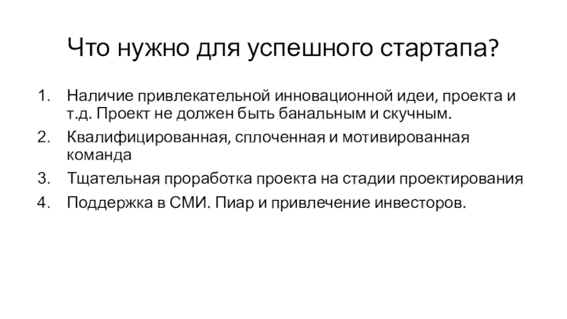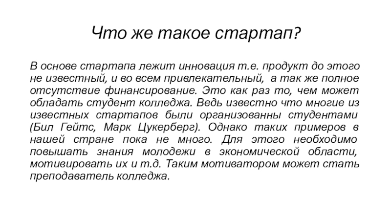 до этого не известный, и во всем привлекательный, а так же полное отсутствие финансирование. Это как раз то, чем может обладать студент колледжа. Ведь известно что многие из известных стартапов были организованны студентами (Бил Гейтс, Марк Цукерберг). Однако таких примеров в нашей стране пока не много. Для этого необходимо повышать знания молодежи в экономической области, мотивировать их и т.д. Таким мотиватором может стать преподаватель колледжа.