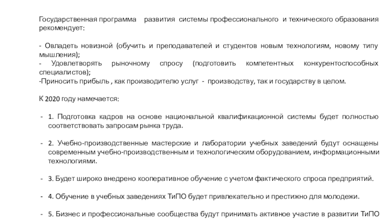 Слайд 3Государственная программа развития системы профессионального и технического образования рекомендует: