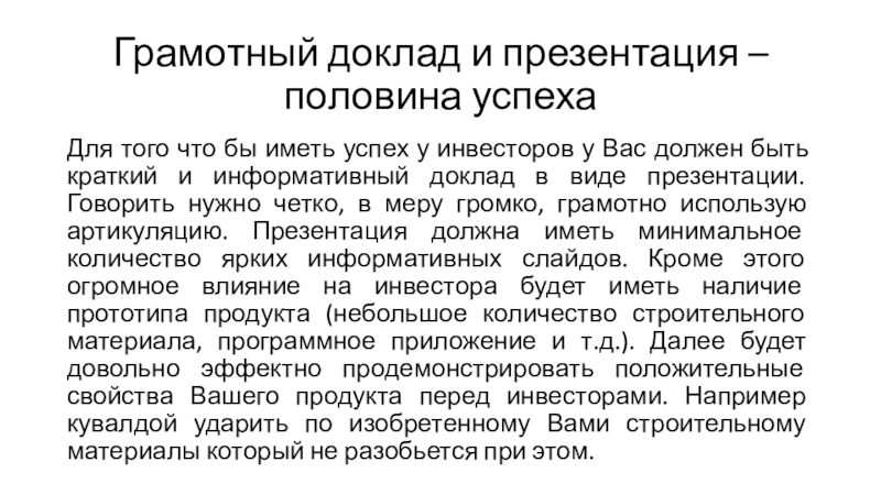 успех у инвесторов у Вас должен быть краткий и информативный доклад в виде презентации. Говорить нужно четко, в меру громко, грамотно использую артикуляцию. Презентация должна иметь минимальное количество ярких информативных слайдов. Кроме этого огромное влияние на инвестора будет иметь наличие прототипа продукта (небольшое количество строительного материала, программное приложение и т.д.). Далее будет довольно эффектно продемонстрировать положительные свойства Вашего продукта перед инвесторами. Например кувалдой ударить по изобретенному Вами строительному материалы который не разобьется при этом.