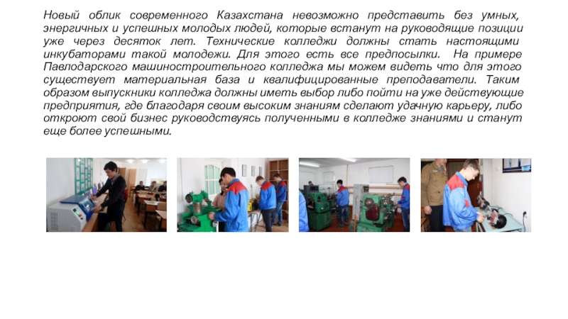 молодых людей, которые встанут на руководящие позиции уже через десяток лет. Технические колледжи должны стать настоящими инкубаторами такой молодежи. Для этого есть все предпосылки. На примере Павлодарского машиностроительного колледжа мы можем видеть что для этого существует материальная база и квалифицированные преподаватели. Таким образом выпускники колледжа должны иметь выбор либо пойти на уже действующие предприятия, где благодаря своим высоким знаниям сделают удачную карьеру, либо откроют свой бизнес руководствуясь полученными в колледже знаниями и станут еще более успешными.