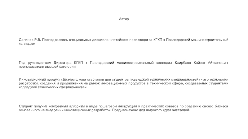 Сапинов Р.В. Преподаватель специальных дисциплин литейного производства КГКП « Павлодарский