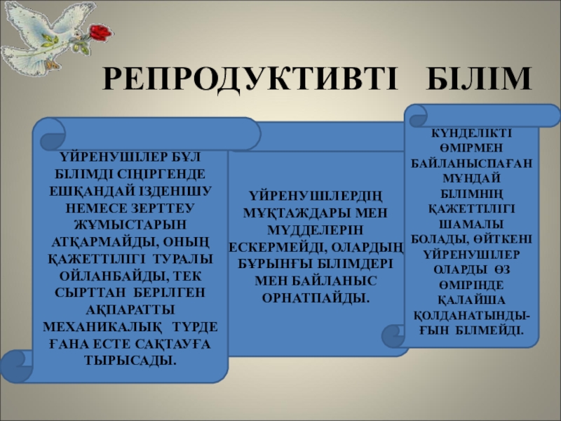 ҮЙРЕНУШІЛЕР БҰЛ БІЛІМДІ СІҢІРГЕНДЕ ЕШҚАНДАЙ ІЗДЕНІШУ НЕМЕСЕ ЗЕРТТЕУ ЖҰМЫСТАРЫН АТҚАРМАЙДЫ, ОНЫҢ ҚАЖЕТТІЛІГІ ТУРАЛЫ ОЙЛАНБАЙДЫ, ТЕК СЫРТТАН БЕРІЛГЕН АҚПАРАТТЫ МЕХАНИКАЛЫҚ ТҮРДЕ ҒАНА ЕСТЕ САҚТАУҒА ТЫРЫСАДЫ.