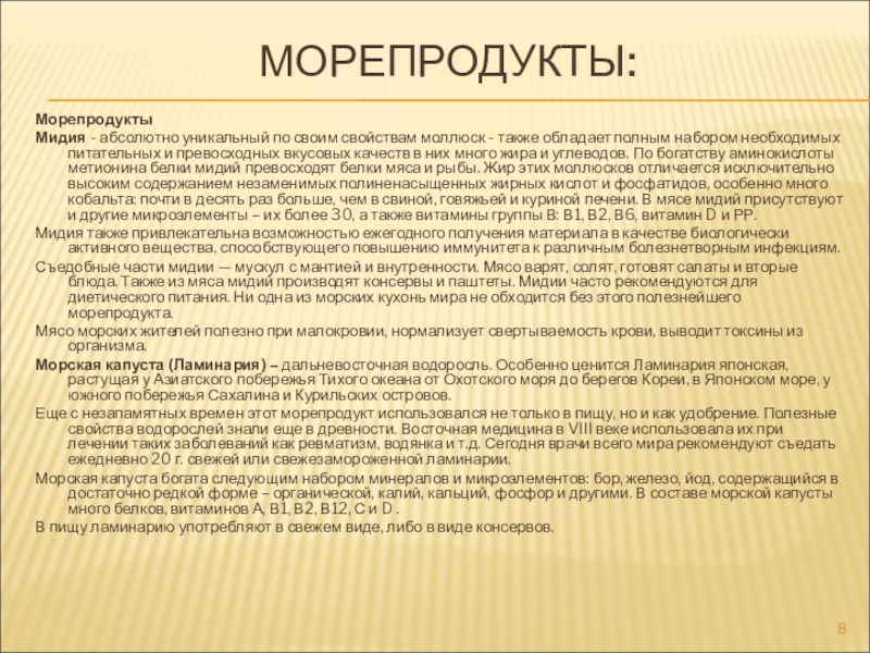 Морепродукты – это здоровая, экологически чистая пища. Морские жители свободные и вольнолюбивые. Они живут на воле и впитывают в себя обычную среду обитания - глубокое чистое море.