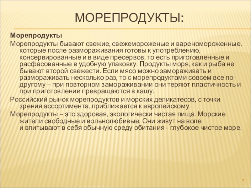 употреблению, консервированные и в виде пресервов, то есть приготовленные и расфасованные в удобную упаковку. Продукты моря, как и рыба не бывают второй свежести. Если мясо можно замораживать и размораживать несколько раз, то с морепродуктами совсем все по-другому – при повторном замораживании они теряют пластичность и при приготовлении превращаются в кашу.