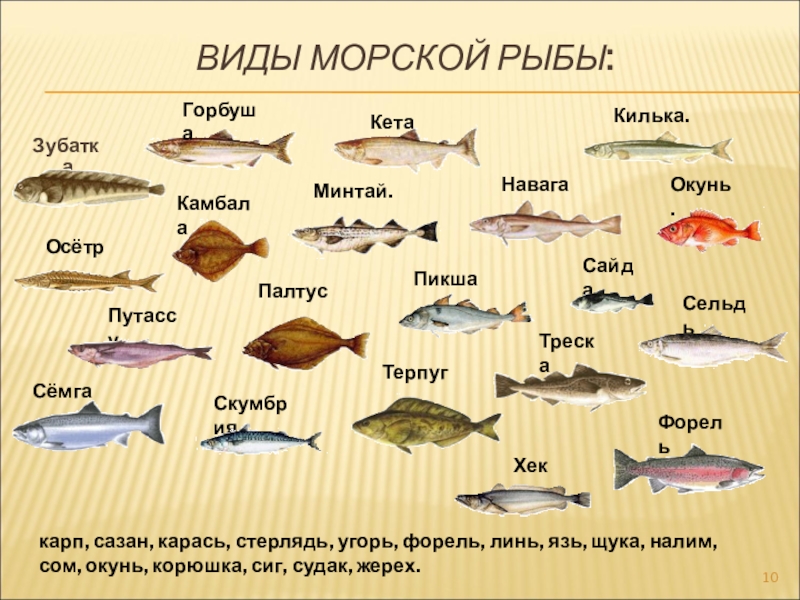 Слайд 10ВИДЫ МОРСКОЙ РЫБЫ: