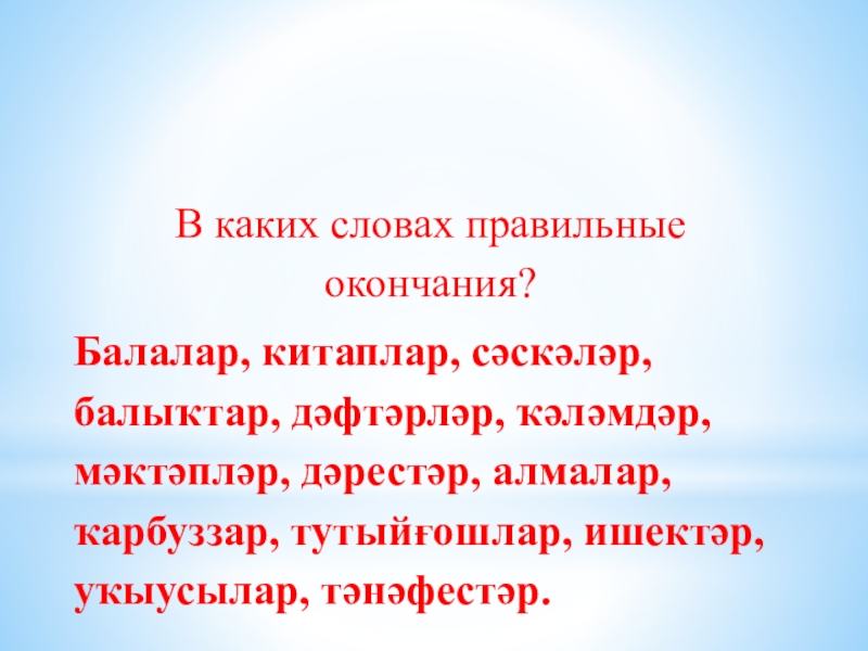 В каких словах правильные окончания?Балалар, китаплар, сәскәләр, балыҡтар, дәфтәрләр, ҡәләмдәр, мәктәпләр, дәрестәр, алмалар, ҡарбуззар, тутыйғошлар, ишектәр, уҡыусылар,