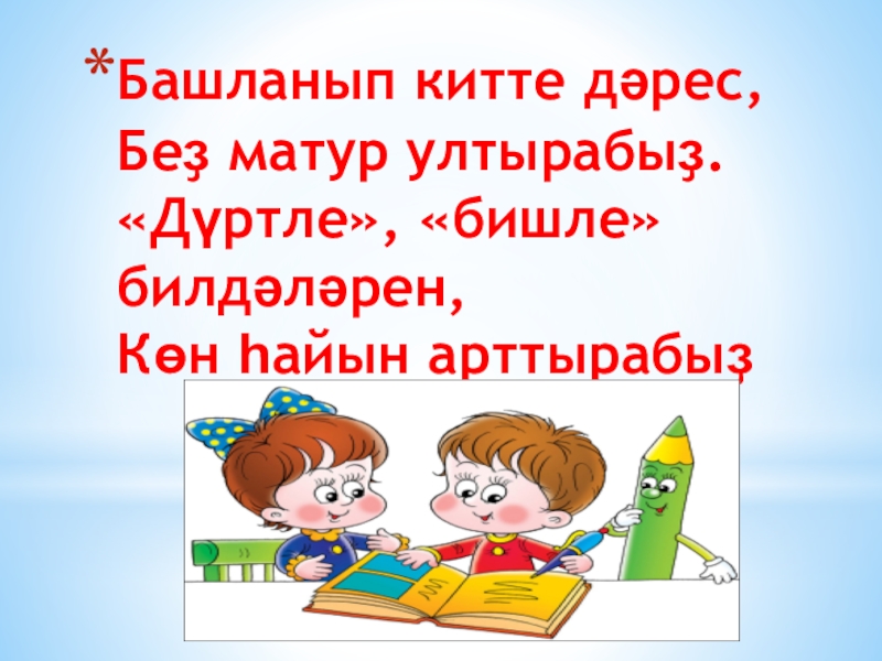 Слайд 5Башланып китте дәрес, Беҙ матур ултырабыҙ. «Дүртле», «бишле» билдәләрен, Көн һайын арттырабыҙ