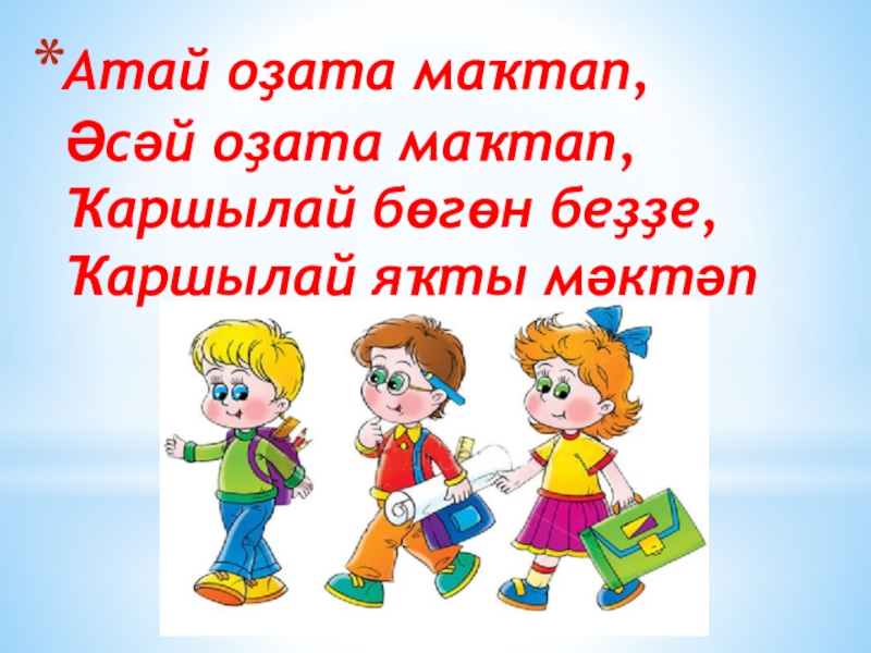 Слайд 4Атай оҙата маҡтап, Әсәй оҙата маҡтап, Ҡаршылай бөгөн беҙҙе, Ҡаршылай яҡты мәктәп