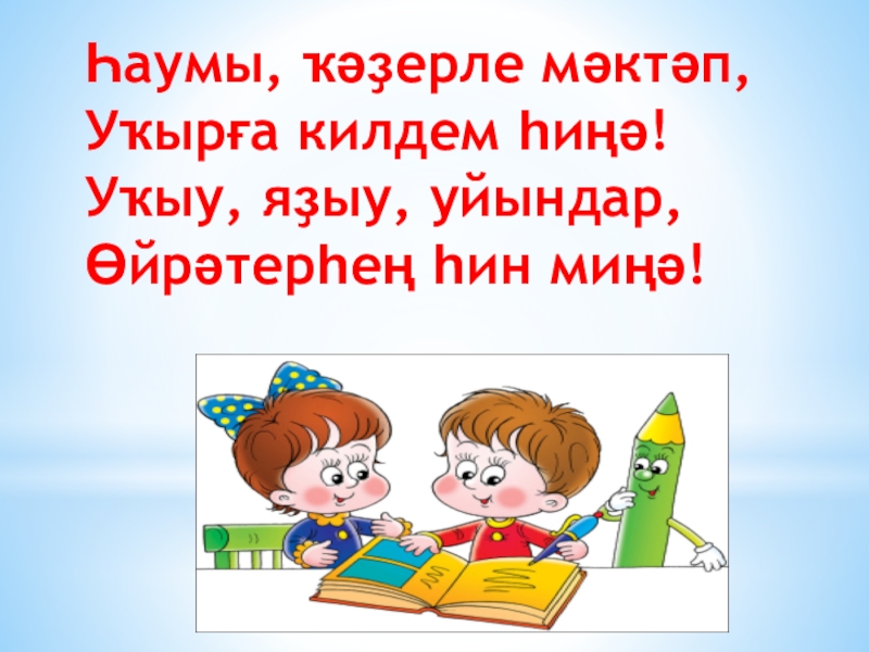 Слайд 6Һаумы, ҡәҙерле мәктәп, Уҡырға килдем һиңә! Уҡыу, яҙыу, уйындар, Өйрәтерһең һин миңә!