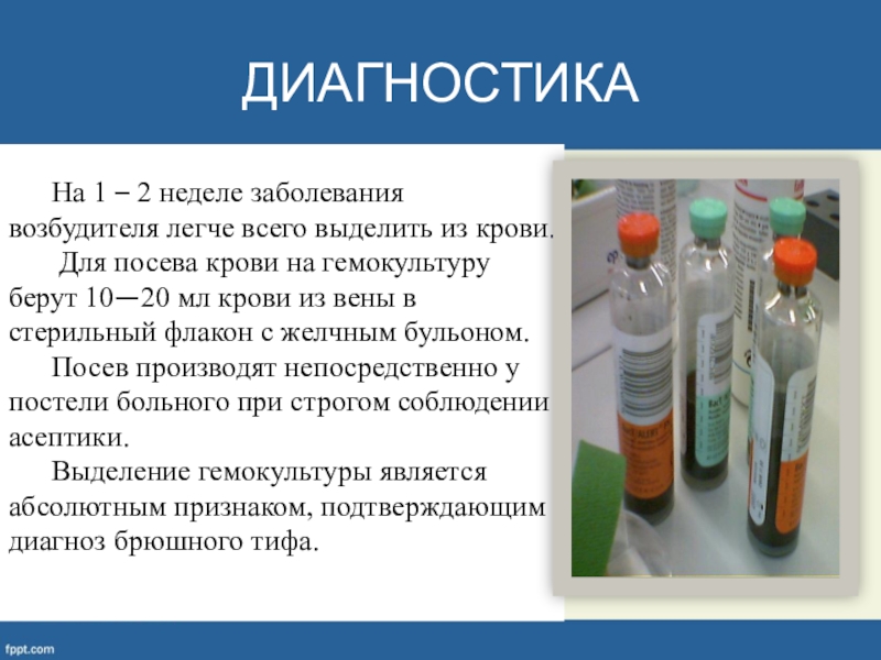 Выделение гемокультуры является абсолютным признаком, подтверждающим диагноз брюшного тифа.