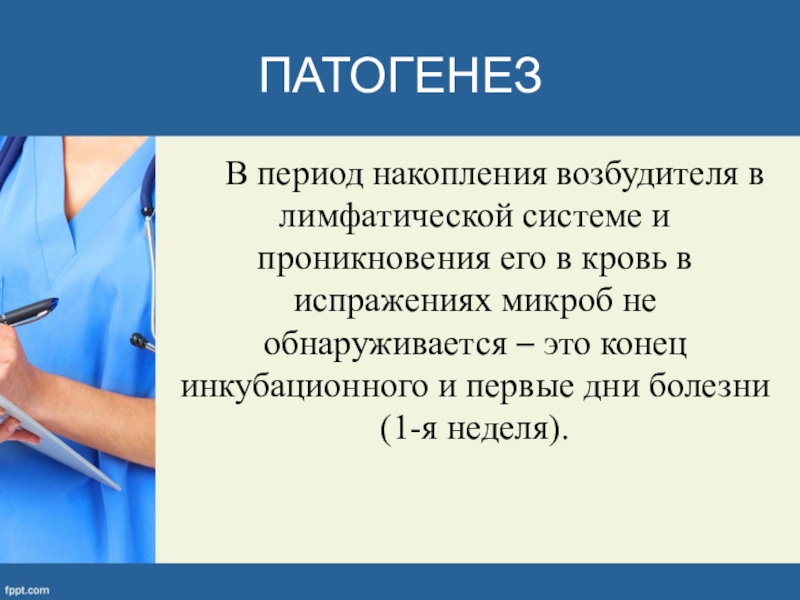 кровь в испражениях микроб не обнаруживается – это конец инкубационного и первые дни болезни (1-я неделя).