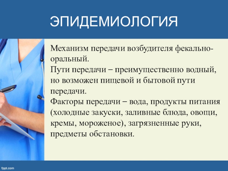 Факторы передачи – вода, продукты питания (холодные закуски, заливные блюда, овощи, кремы, мороженое), загрязненные руки, предметы обстановки.