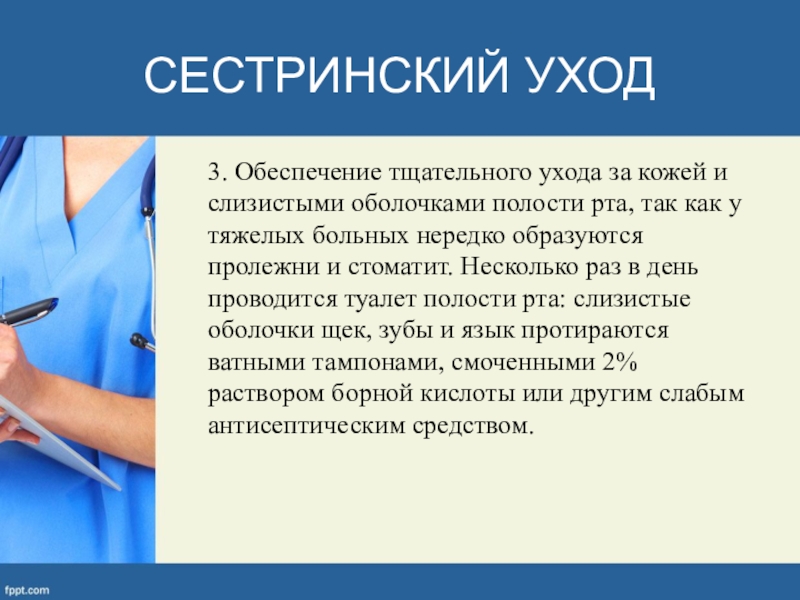 3. Обеспечение тщательного ухода за кожей и слизистыми оболочками полости