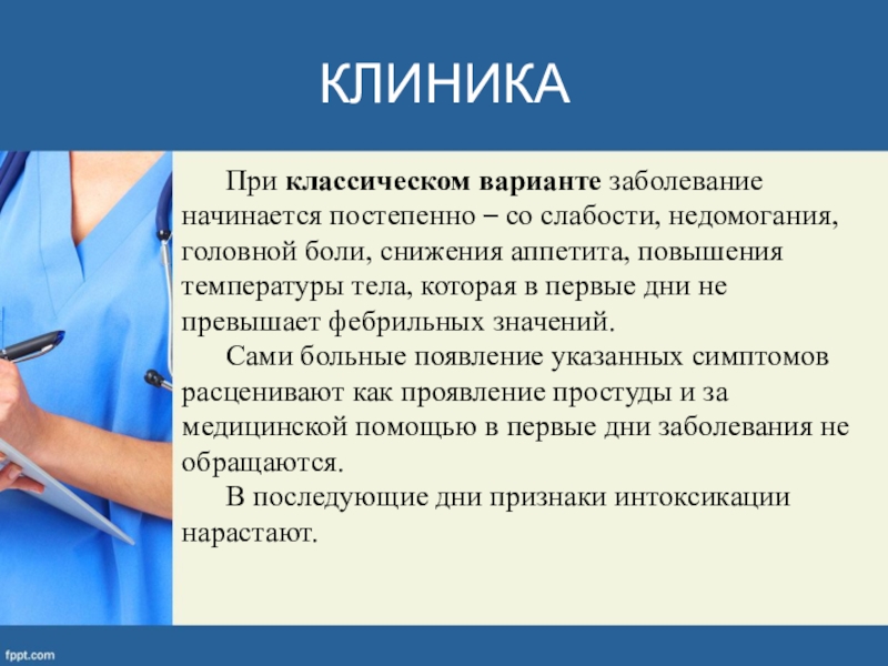 При классическом варианте заболевание начинается постепенно – со слабости, недомогания, головной