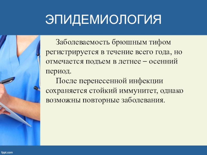 Заболеваемость брюшным тифом регистрируется в течение всего года, но отмечается подъем