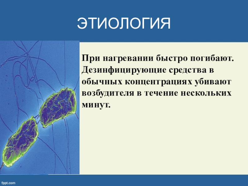 При нагревании быстро погибают. Дезинфицирующие средства в обычных концентрациях убивают возбудителя