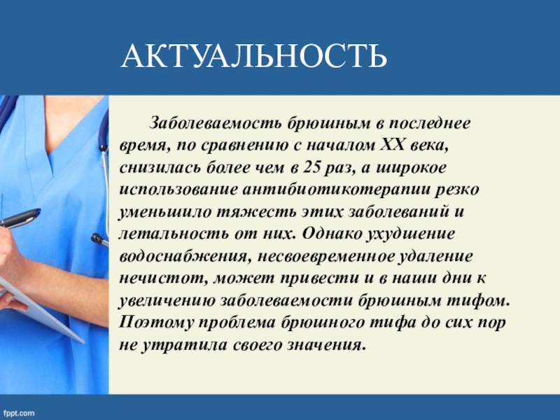 века, снизилась более чем в 25 раз, а широкое использование антибиотикотерапии резко уменьшило тяжесть этих заболеваний и летальность от них. Однако ухудшение водоснабжения, несвоевременное удаление нечистот, может привести и в наши дни к увеличению заболеваемости брюшным тифом. Поэтому проблема брюшного тифа до сих пор не утратила своего значения.