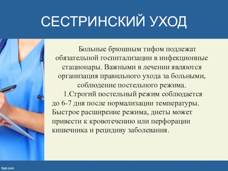 1.Строгий постельный режим соблюдается до 6-7 дня после нормализации температуры. Быстрое расширение режима, диеты может привести к кровотечению или перфорации кишечника и рецидиву заболевания.
