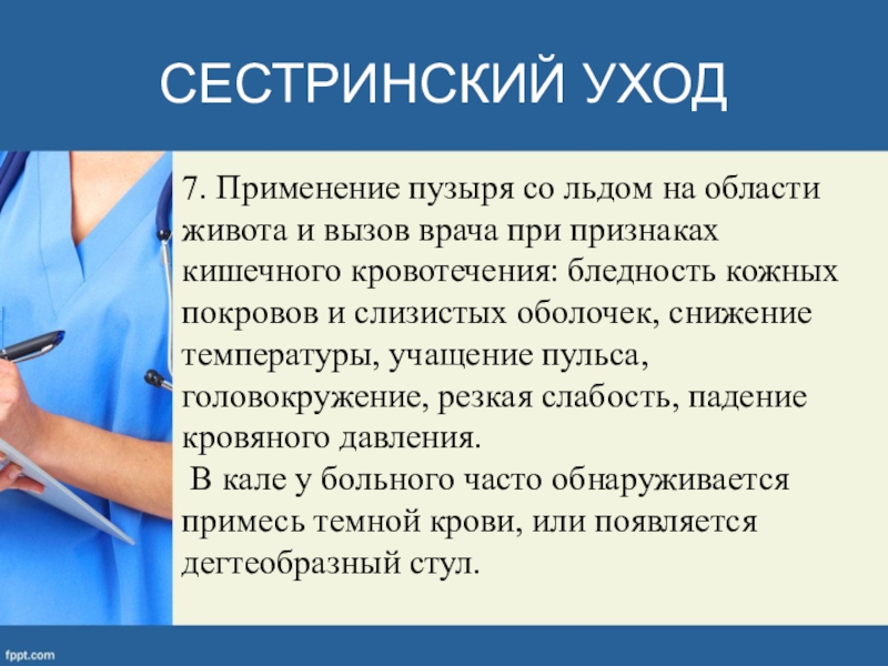врача при признаках кишечного кровотечения: бледность кожных покровов и слизистых оболочек, снижение температуры, учащение пульса, головокружение, резкая слабость, падение кровяного давления.