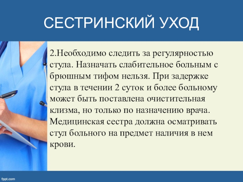 тифом нельзя. При задержке стула в течении 2 суток и более больному может быть поставлена очистительная клизма, но только по назначению врача. Медицинская сестра должна осматривать стул больного на предмет наличия в нем крови.