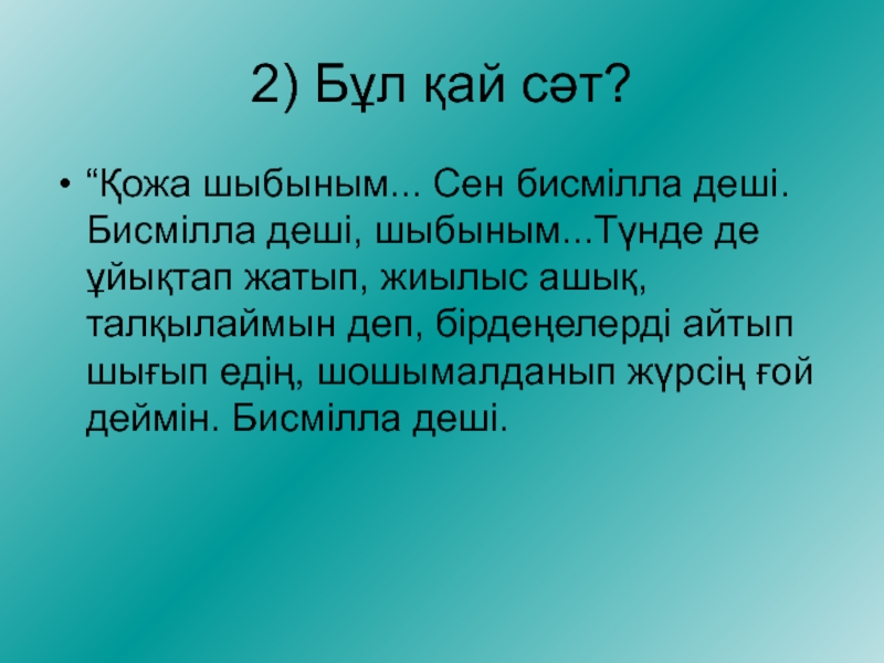 2) Бұл қай сәт?“Қожа шыбыным... Сен бисмілла деші.Бисмілла деші, шыбыным...Түнде де ұйықтап жатып, жиылыс ашық, талқылаймын деп,