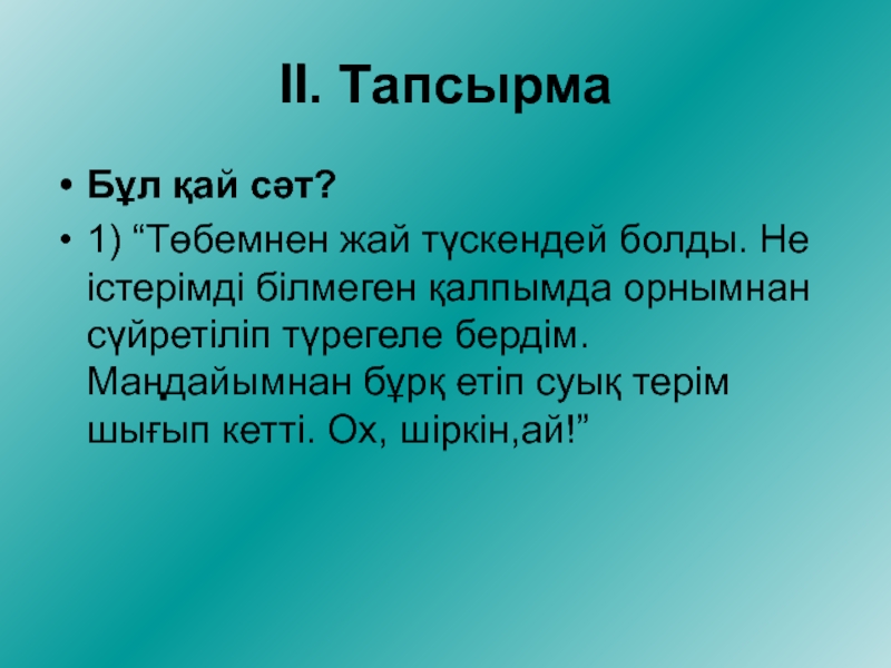ІІ. ТапсырмаБұл қай сәт?1) “Төбемнен жай түскендей болды. Не істерімді білмеген қалпымда орнымнан сүйретіліп түрегеле бердім. Маңдайымнан
