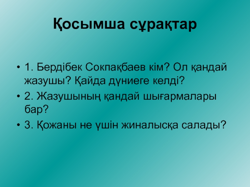 Қосымша сұрақтар1. Бердібек Сокпақбаев кім? Ол қандай жазушы? Қайда дүниеге келді? 2. Жазушының қандай шығармалары бар?3. Қожаны