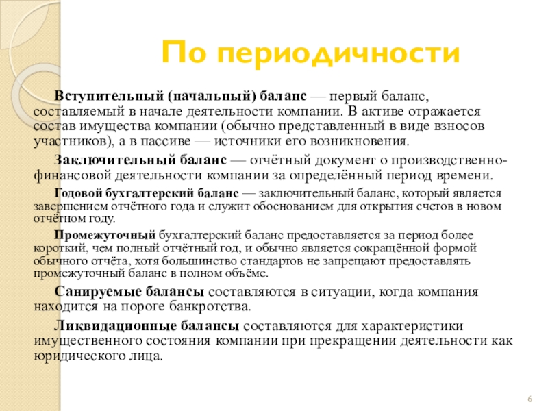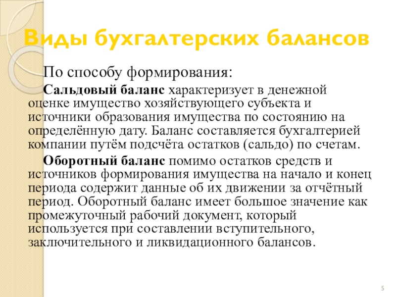 субъекта и источники образования имущества по состоянию на определённую дату. Баланс составляется бухгалтерией компании путём подсчёта остатков (сальдо) по счетам.