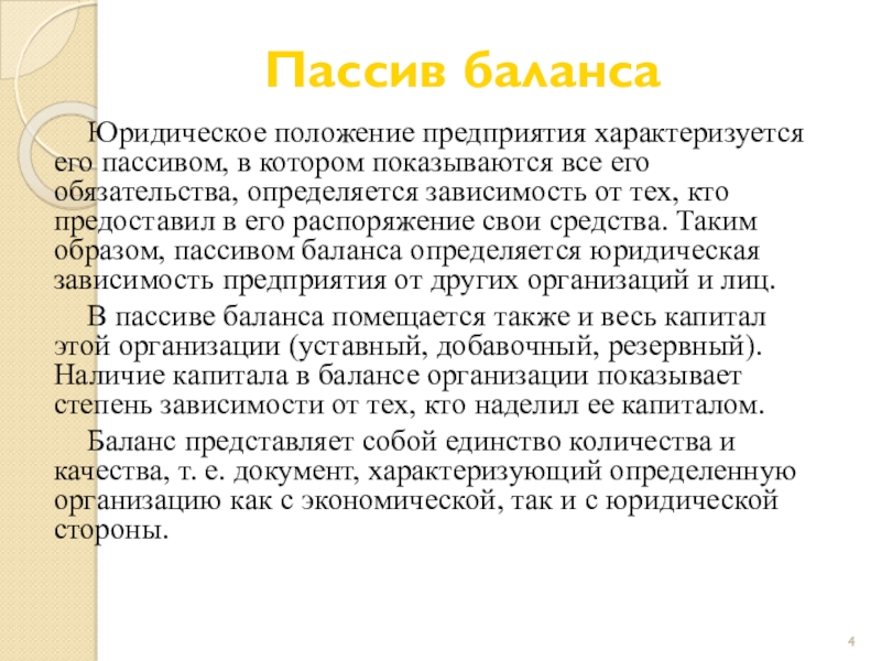Юридическое положение предприятия характеризуется его пассивом, в котором показываются все