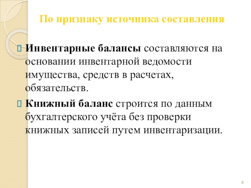 Книжный баланс строится по данным бухгалтерского учёта без проверки книжных записей путем инвентаризации.