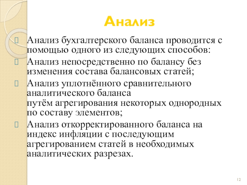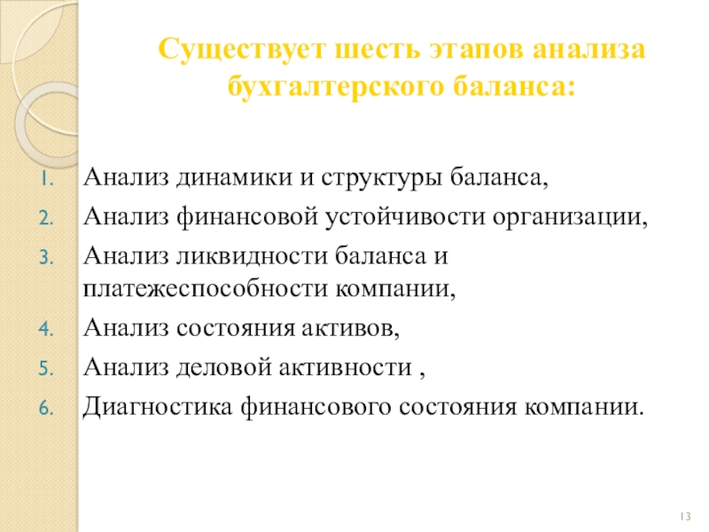 Слайд 13Существует шесть этапов анализа бухгалтерского баланса:
