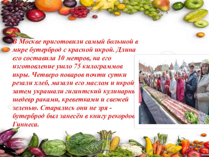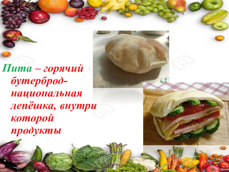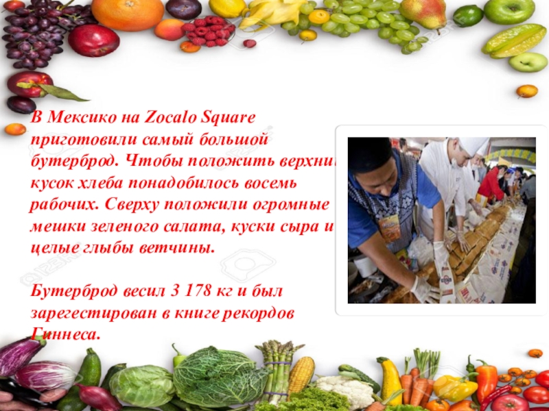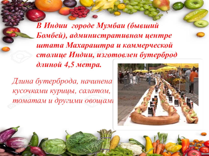 Длина бутерброда, начинена кусочками курицы, салатом, томатам и другими овощами.