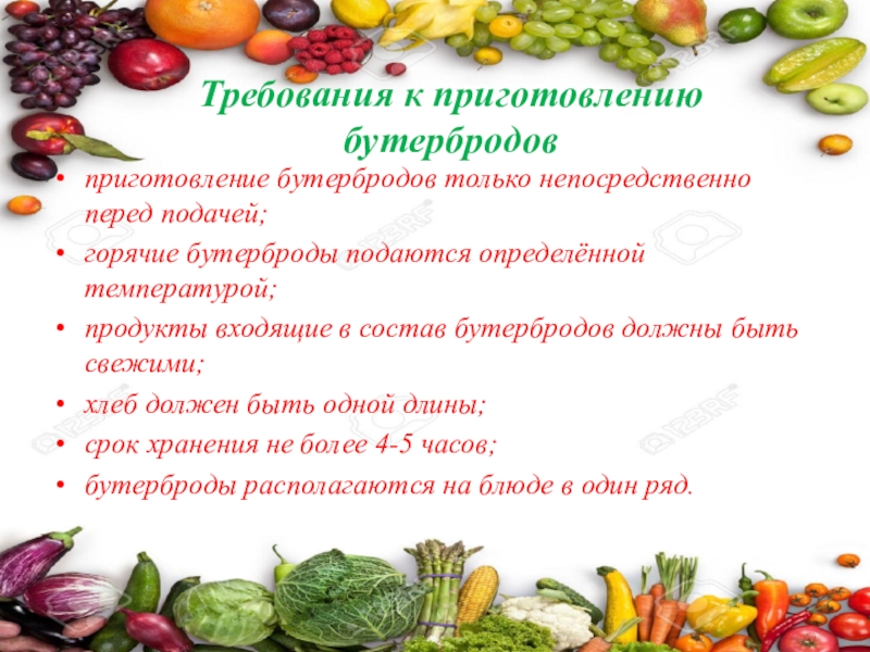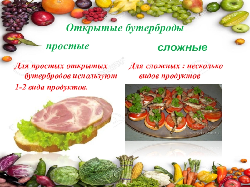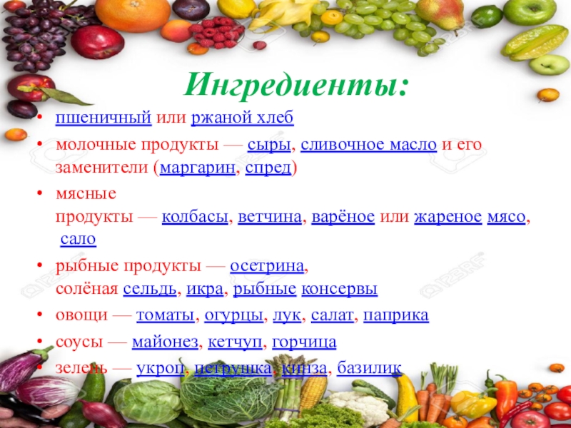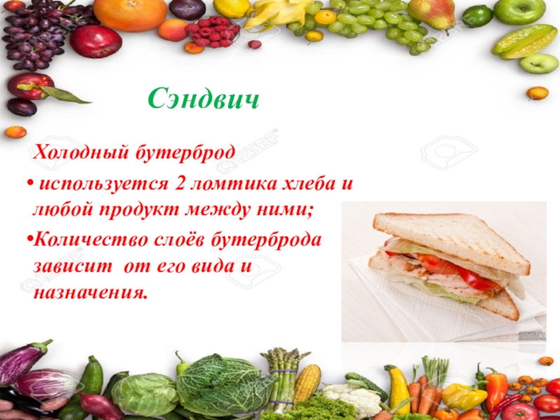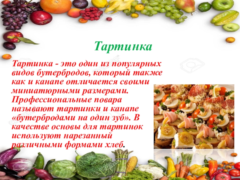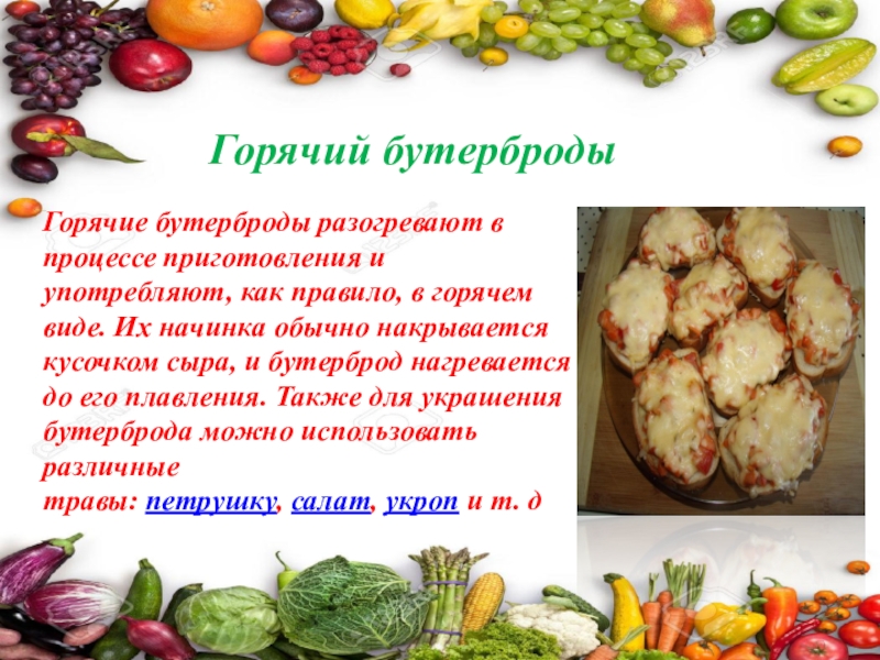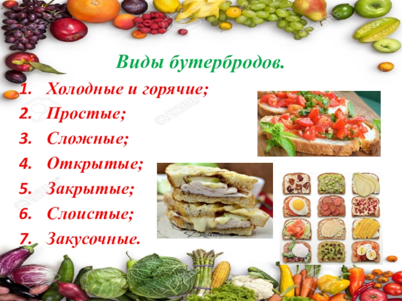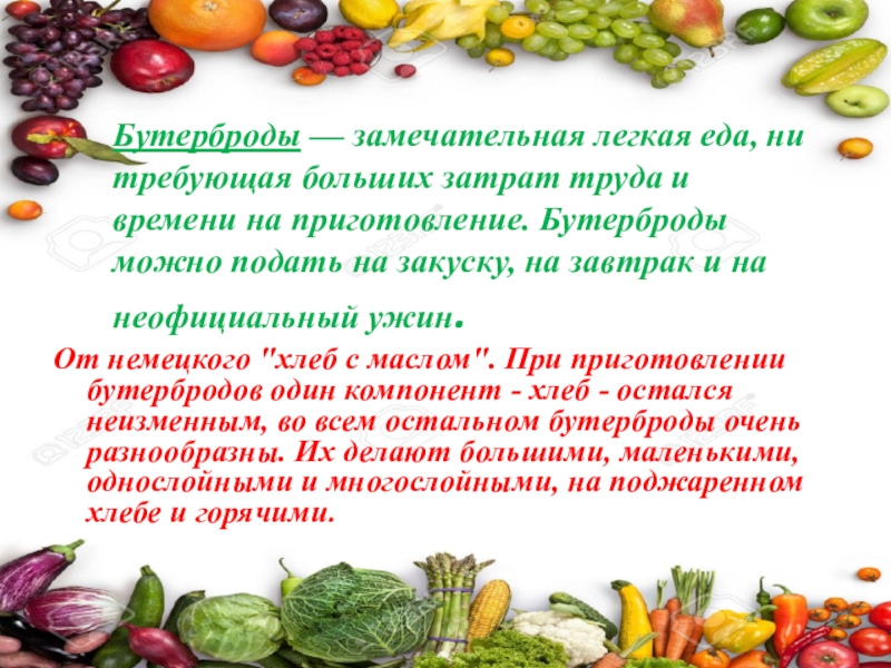 От немецкого "хлеб с маслом". При приготовлении бутербродов один компонент - хлеб - остался неизменным, во всем остальном бутерброды очень разнообразны. Их делают большими, маленькими, однослойными и многослойными, на поджаренном хлебе и горячими.