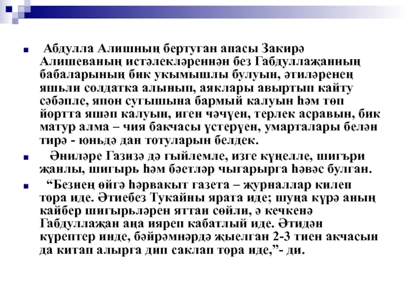 Слайд 8 Абдулла Алишның бертуган апасы Закирә Алишеваның истәлекләреннән без Габдуллаҗанның бабаларының