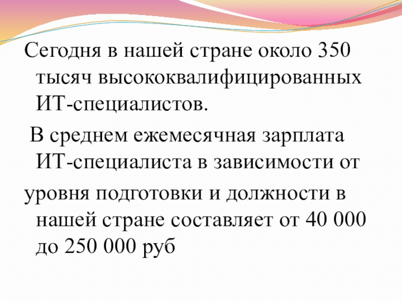 Сегодня в нашей стране около 350 тысяч высококвалифицированных ИТ-специалистов. В среднем ежемесячная зарплата ИТ-специалиста в зависимости от