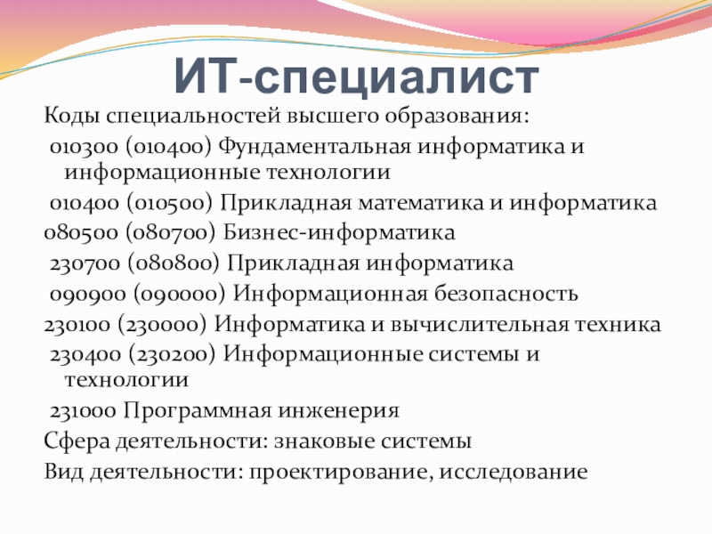 ИТ-специалистКоды специальностей высшего образования: 010300 (010400) Фундаментальная информатика и информационные технологии 010400 (010500) Прикладная математика и информатика080500