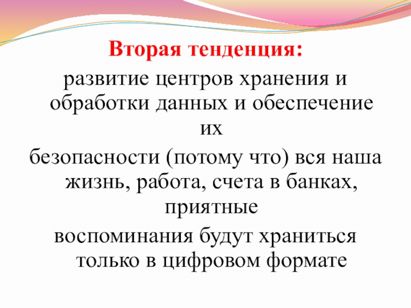 Вторая тенденция: развитие центров хранения и обработки данных и обеспечение их безопасности (потому что) вся наша жизнь,