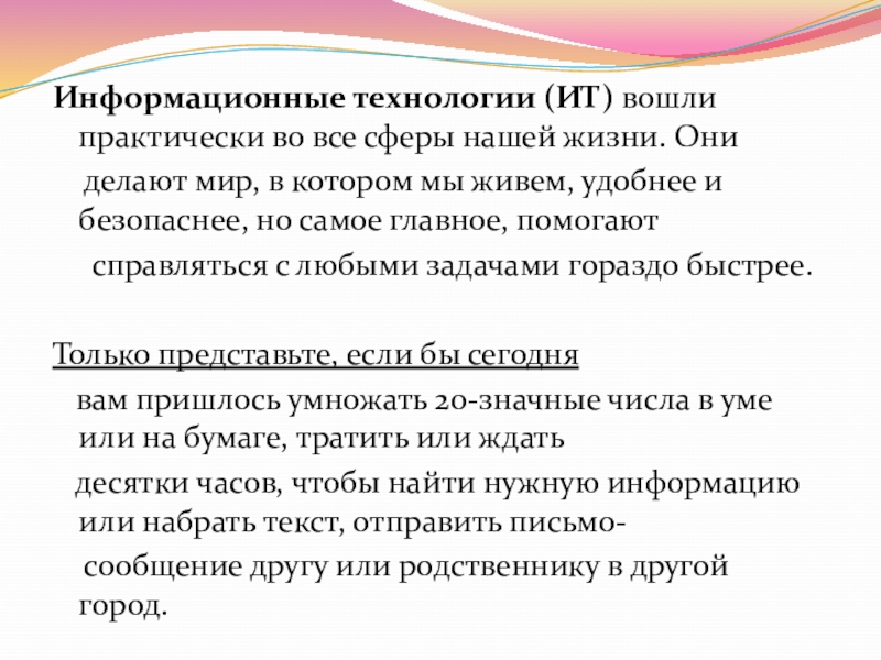 Информационные технологии (ИТ) вошли практически во все сферы нашей жизни. Они   делают мир, в котором