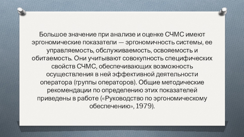 Слайд 9Большое значение при анализе и оценке СЧМС имеют эргономические показатели —