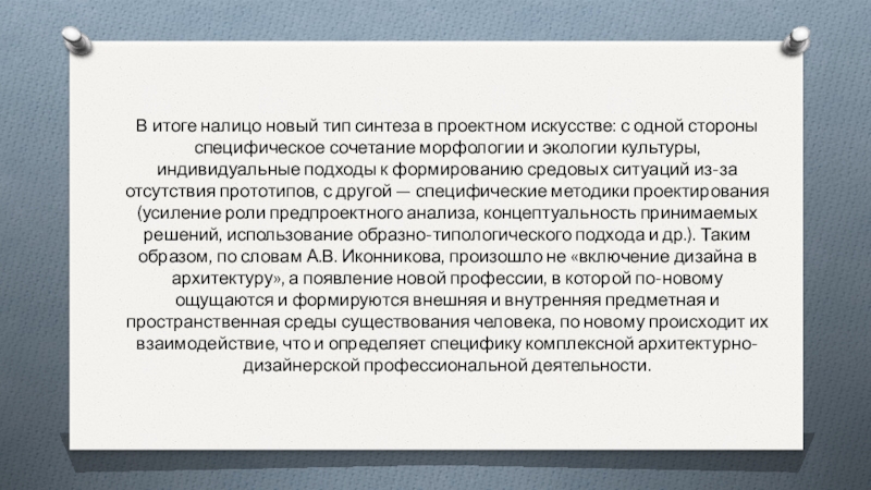 стороны специфическое сочетание морфологии и экологии культуры, индивидуальные подходы к формированию средовых ситуаций из-за отсутствия прототипов, с другой — специфические методики проектирования (усиление роли предпроектного анализа, концептуальность принимаемых решений, использование образно-типологического подхода и др.). Таким образом, по словам А.В. Иконникова, произошло не «включение дизайна в архитектуру», а появление новой профессии, в которой по-новому ощущаются и формируются внешняя и внутренняя предметная и пространственная среды существования человека, по новому происходит их взаимодействие, что и определяет специфику комплексной архитектурно-дизайнерской профессиональной деятельности.