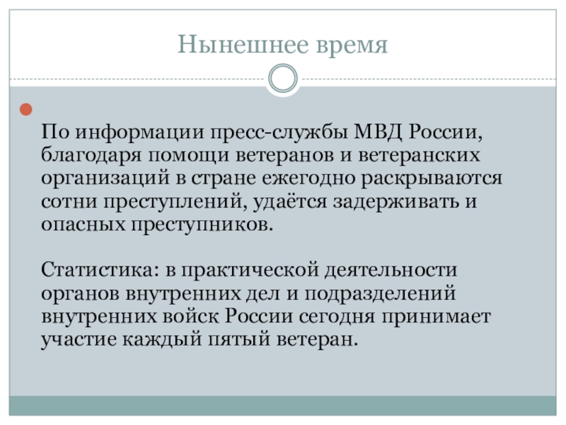 Нынешнее время По информации пресс-службы МВД России, благодаря помощи ветеранов и ветеранских организаций в стране ежегодно раскрываются