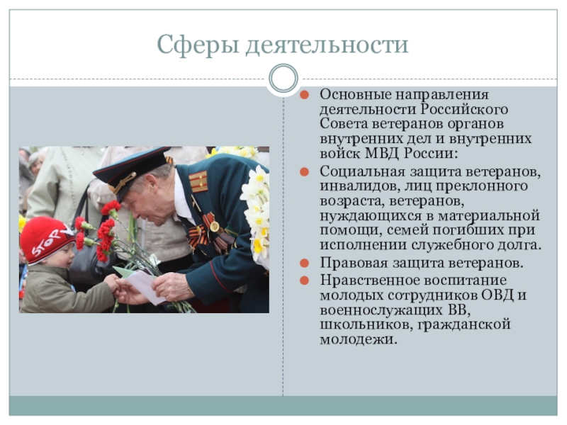 Сферы деятельностиОсновные направления деятельности Российского Совета ветеранов органов внутренних дел и внутренних войск МВД России:Социальная защита ветеранов,