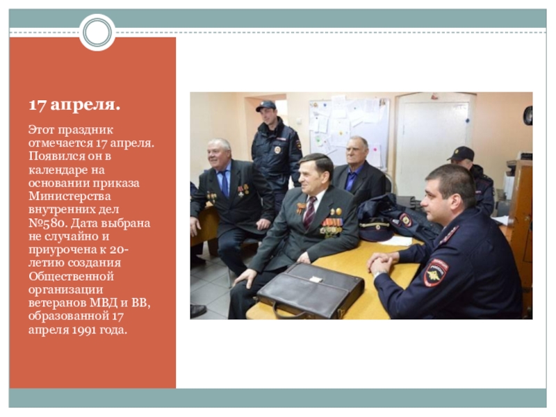 17 апреля.Этот праздник отмечается 17 апреля. Появился он в календаре на основании приказа Министерства внутренних дел №580. Дата выбрана не случайно и приурочена к 20-летию создания Общественной организации ветеранов МВД и ВВ, образованной 17 апреля 1991