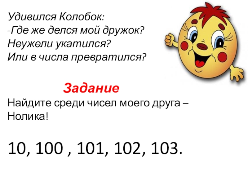 Удивился Колобок: -Где же делся мой дружок? Неужели укатился? Или в числа превратился? Задание Найдите среди чисел моего друга – Нолика! 10, 100 ,